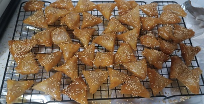 Ponemos las miel y el agua de azahar en un cazo y calentamos una vez caliente bañamos nuestros briouats. - Vamos sacando una vez bañados sobre una rejilla y los espolvoreamos con el sésamo y dejamos enfriar.