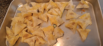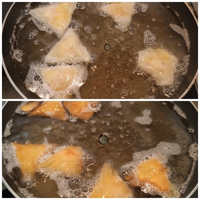 - Ponemos aceite abundante en una sartén y cuando esté caliente iremos friendo los briouats por tandas de 1-2 minutos aproximadamente, hasta que estén dorados. Sacamos sobre papel adsorbente.