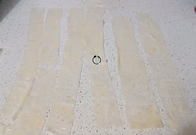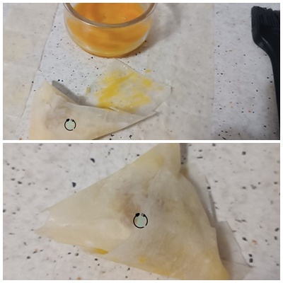 - Pincelamos el final con la yema semi batida y sellamos, De este modo haremos con todas las tiras de masa filo.