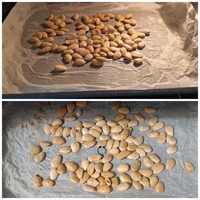 - Vamos a empezar la receta precalentando el horno a 200ºC. Forramos la bandeja del horno con papel de hornear y volcamos 125ºC de almendras las extendemos y tostamos durante 5-10 minutos a 200ºC o hasta que estén doradas. Retiramos y dejamos enfriar.