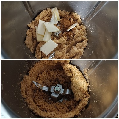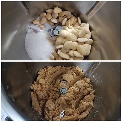 - Ponemos en el vaso de la picadora las almendras tostadas, las almendras crudas, y el azúcar y trituramos.
