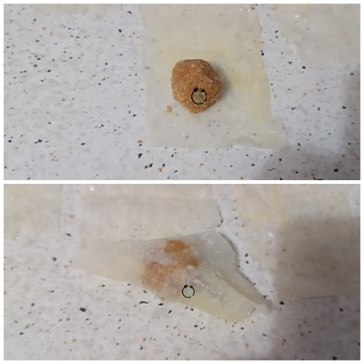 - Ponemos una bola de la pasta de almendras en un extremo, vamos doblando en triángulos sobre si misma..
