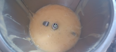 - Acto seguido añadimos el agua, el zumo de limón y las yemas de huevo y programamos 7 Min, 90º, Vel 4.