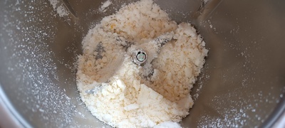 - Seguimos con la receta y ponemos en el vaso el azúcar las pieles de limón y programamos 8 Seg, Vel 10. Una vez terminado el tiempo bajamos los restos de las paredes hacia las cuchillas con ayuda de la espátula.