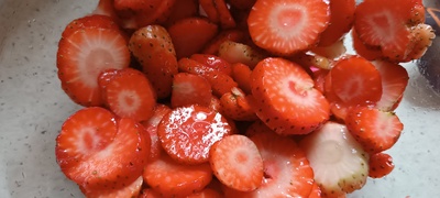 - Pesamos las fresas y las laminamos. Ahora les agregamos el licor de cereza. Mezclamos bien y reservamos.