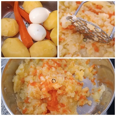 - Empezamos la receta poniendo a cocer los huevos en un cazo y los dejamos cocinar 10 minutos. Pasados los 10 minutos le quitamos el agua caliente y le ponemos agua fría y pelamos. Reservamos. Por otra parte ponemos en una cacerola las patatas, las zanahorias y los huevos cubrimos de agua la llevamos al fuego y dejamos cocinar por 20 minutos, comprobamos si están tiernas y le quitamos el agua caliente, le echamos agua fría. Una vez estén fría las pelamos. Acto seguido machamos las patatas y las zanahorias.