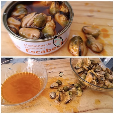 - Ahora vamos con los mejillones escurrimos el aceite reservándolo ya que lo vamos a necesitar más tarde. Cortamos los mejillones por la mitad, reservamos unos cuantos para decorar.