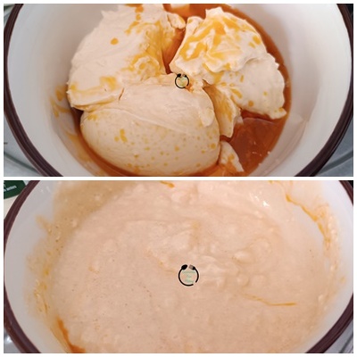 - Seguimos con la mayonesa con escabeche, para ello ponemos las 3 cucharadas de mayonesa y el aceite de los mejillones reservamos un poco para adornar.
