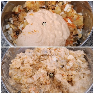 - Picamos los huevos, los incorporamos junto a los mejillones y la mayonesa, mezclamos hasta que tengamos todos los ingredientes bien integrados.