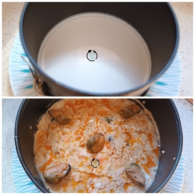 - Con la ayuda de un aro emplatamos y adornamos con los mejillones reservados y con un poco del aceite reservado.