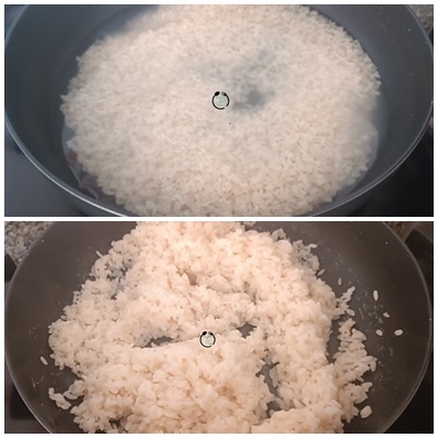 - Vamos a empezar la receta poniendo el arroz en una cacerola y seguidamente vertemos el agua. Ponemos la cacerola a fuego medio bajo y dejamos cocinar hasta que casi se haya consumido el agua, tenemos que tener cuidado de que nos se nos queme el arroz. nos debe de quedar el arroz tierno.