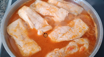Incorporamos los lomos al guiso dejamos cocinar 5 minutos más. Añadimos al mojo unas cucharadas del caldo del guiso, mezclamos bien y lo añadimos al guiso. Comprobamos el punto de sal y dejamos cocinar 2 minutos más. - Y ya tenemos nuestro guiso listo para espolvorear con perejil picado y servir.
