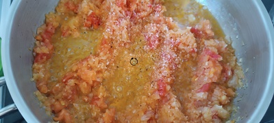 - Empezamos la receta picando la cebolla, el diente de ajo y los tomates que le habremos quitado la piel previamente. Ponemos en una sartén grande unas 3 o 4 cucharadas de aceite y sofreímos hasta que la cebolla este tierna unos 10-12 minutos a fuego medio bajo. Añadimos el ajo y seguimos sofriendo 2 minutos, pasado el tiempo agregamos el tomate y salpimentamos y después dejamos sofreír 10 minutos.