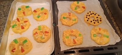 Dejamos levar hasta que doble su volumen. Mientras precalentamos el horno a 200ºC. Una vez haya doblado su volumen horneamos cada bandeja 10 minutos a 200ºC.