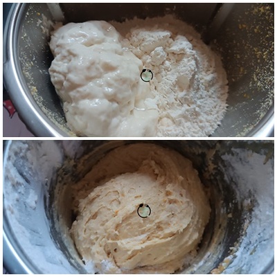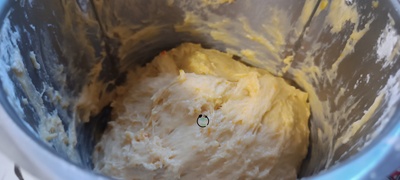 - Añadimos la leche, la mantequilla, los huevos, la levadura, el agua de azahar, la harina, la sal y la esponja reservada. Programamos 30 Seg, Vel 6. Ahora programamos Amasar 3 Min, Vel Espiga.