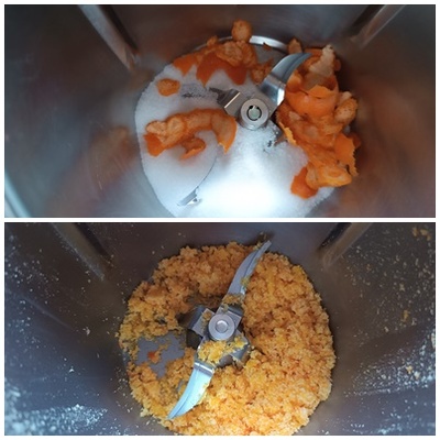 A continuación el azúcar, la de naranja . Programamos 20 Seg, Vel 10. Nos ayudamos con la espátula y bajamos el azúcar aromatizado hacia las cuchillas.