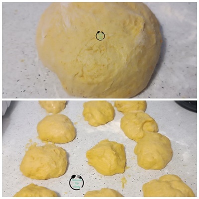 - Volcamos la masa en la mesa de trabajo enharinada. Formamos una bola alisándola bien con las manos. Dividimos la masa en 12 porciones de unos 100 grs aproximadamente. Les damos forma de bola.