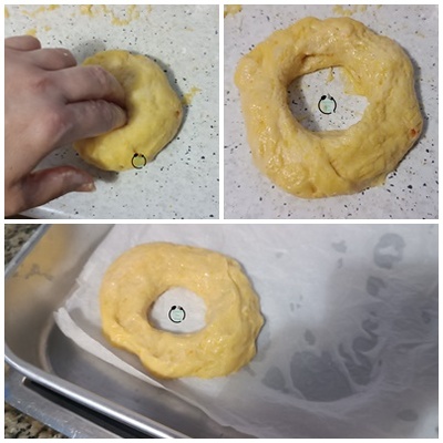 Ahora vamos a darle forma a nuestros mini roscones para ello introducimos los dedos en el centro y abrimos la masa de manera nos quede un agujero de 4 cm. y vamos poniendo en la bandeja de horno.