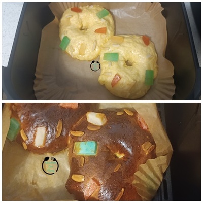 - Vamos a hornear para ello ponemos en el cestillo nuestros mini roscones y programamos 8-10 minutos a 180ºC estaremos pendientes para que no se nos quemen a los 7 minutos comprobamos si están doraditos ya que cada freidora es un mundo. Si vemos que se están dorando demasiado por arriba bajamos la temperatura a 170ºC y le daremos 2-3 minutos extras.